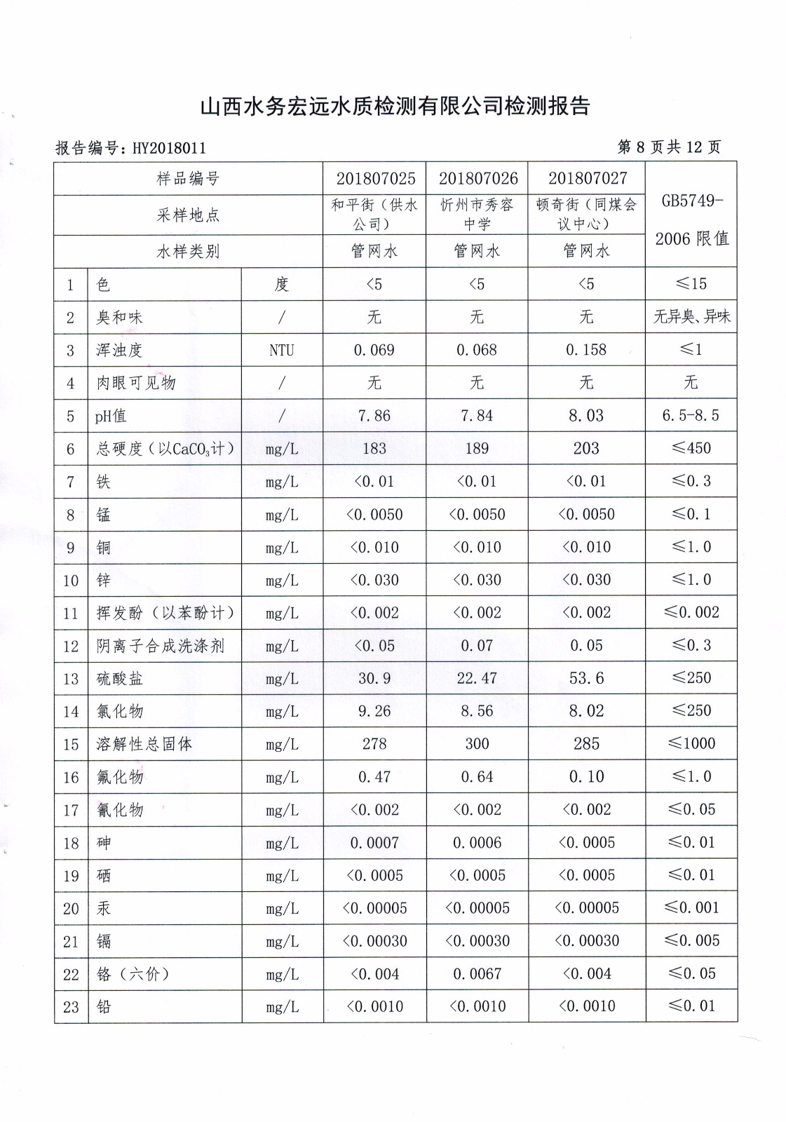 忻州城區(qū)公共供水水源水、出廠水、管網(wǎng)水、管網(wǎng)末梢水2018年7月份水質信息公示