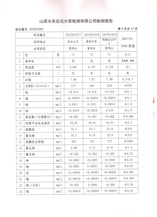 忻州城區(qū)公共供水水源水、出廠水、管網(wǎng)水、管網(wǎng)末梢水2019年1月份水質(zhì)信息公示